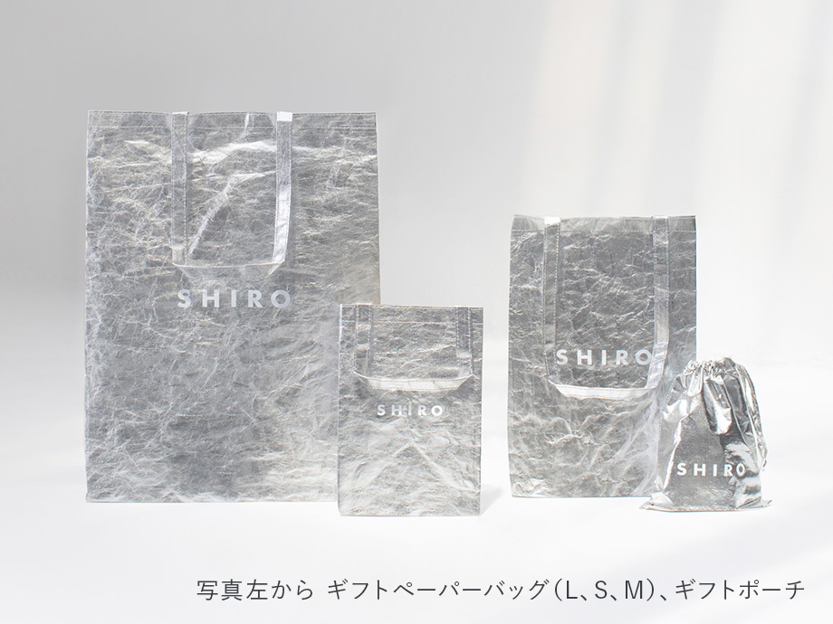 SHIROでは限りある資源を守るために、ギフトラッピングとして「ギフトペーパーバッグ」と「ギフトポーチ」をご用意しています。