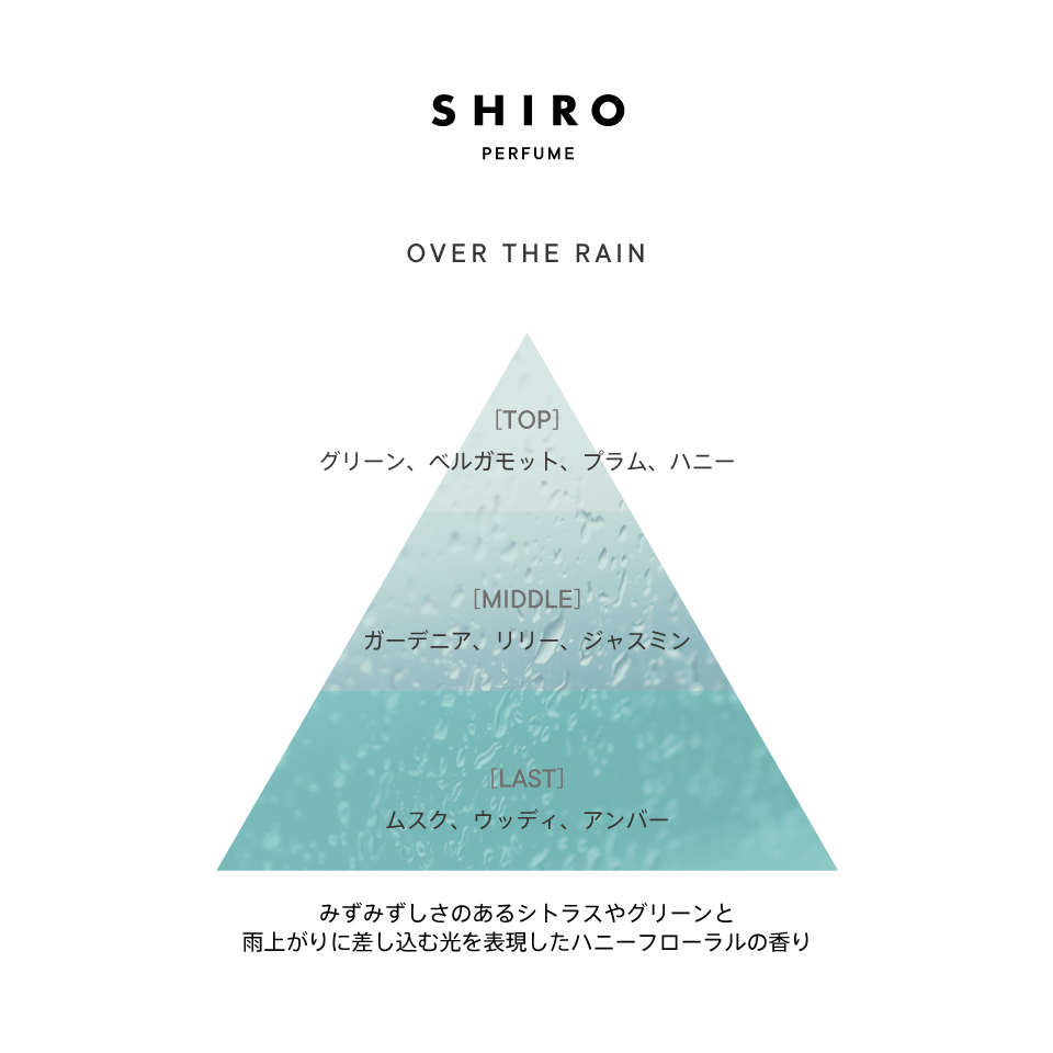 SHIRO PERFUMEとは、世界各国のパフューマーが、自身のアイデンティティや香りに目覚めたきっかけを込め、SHIROらしく創り上げた香水です。 今回登場の『OVER THE RAIN』は、今この瞬間から広がっていく「未来」に着目して誕生しました。 トップのグリーンは雨上がりの木々のようなみずみずしさ、ミドルは水に濡れた花々のような華やかさ、ラストにはムスクの柔らかい甘さが香ります。 晴れわたる空に清々しさを感じるように、気持ちが澄み渡るみずみずしい香りをお楽しみください。 [TOP]グリーン、ベルガモット、プラム、ハニー [MIDDLE]ガーデニア、リリー、ジャスミン [LAST]ムスク、ウッディ、アンバー by Female , Japan <持続時間>約5~6時間 <POINT> ・水のかわりに、徳島県の木頭柚子(きとうゆず)の蒸留水*1を配合。 スキンケアにも使用する、香り豊かな自然素材を配合することで、より深みのある香りに仕上げています。 ・特別仕様のデザインを施しており、箱を開けて製品を手に取ると、“starts from here”というオリジナルメッセージが現れます。 性別・年齢問わず使用でき、大切な方への贈り物にもおすすめです。 *1 ユズ果皮水/保湿・芳香成分 <おすすめの使用方法> しっかりと香らせたい時は、手首や首周り、耳の後ろに使用するのがおすすめです。 香りは上へと立ち上がっていく性質があるため、ウエストや内ももなどに使用し、やさしく香らせることもできます。 <よくあるご質問> ・髪や洋服につけられますか? →アルコールを使用しているため、髪や衣類が傷むおそれがありますので、直接つけることはお控えください。 髪や洋服でふんわりとした香りをお楽しみいただく方法としては、空間に1、2回スプレーをし、その下をくぐることをおすすめいたします。 ・オードパルファンは、未開封で保管した場合いつごろまで香りを保てますか? →未開封の状態で3年は品質を保てるよう製造しております。 変質を防ぐため、開封後はなるべく早くお使いください。 高温・多湿な場所を避け、常温で保存をしていただくのがおすすめです。