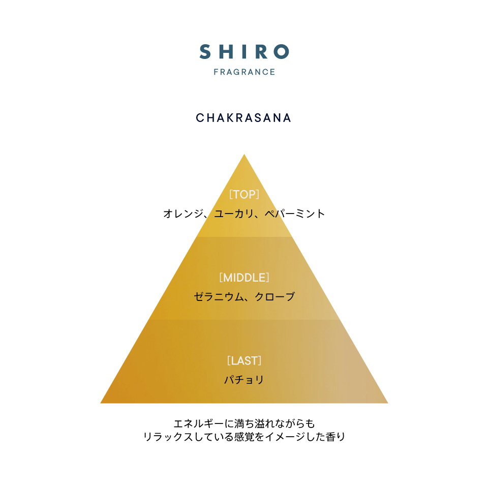 フレッシュなオレンジやスパイシーなクローブ、ほのかな甘さのゼラニウムなど、オリジナルブレンドの精油*3が織りなす「チャクラーサナ」の香り。