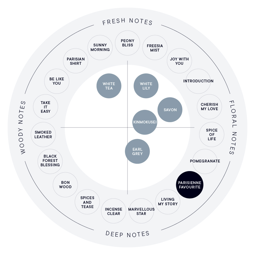 お気に入りの服をまとった女性たちが集い、ロゼワインを片手に、楽しくおしゃべりをしている情景から連想された香りです。