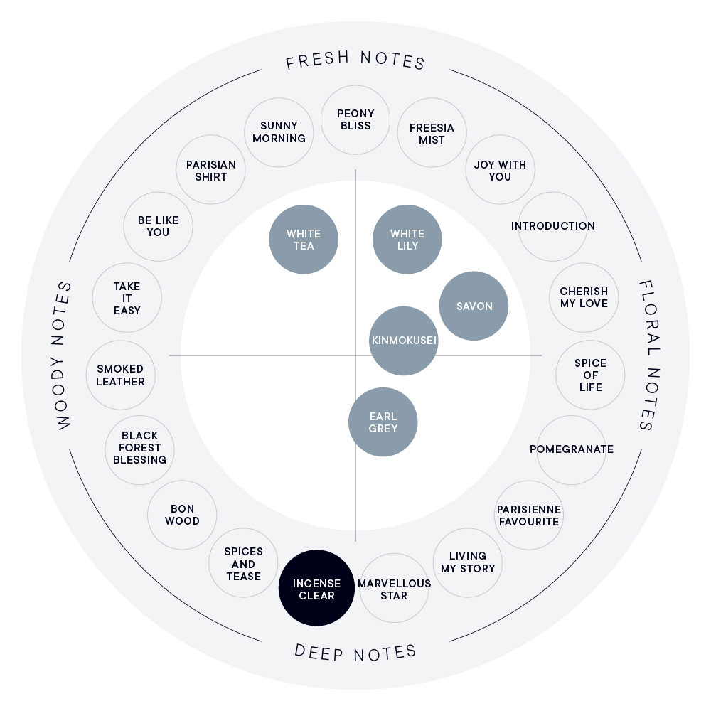 ベルガモットとパインがシャープに香るトップノートから、スパイシーさと華やかなジャスミンが広がり、ムスクとモスの深みある香りへと変化していきます。