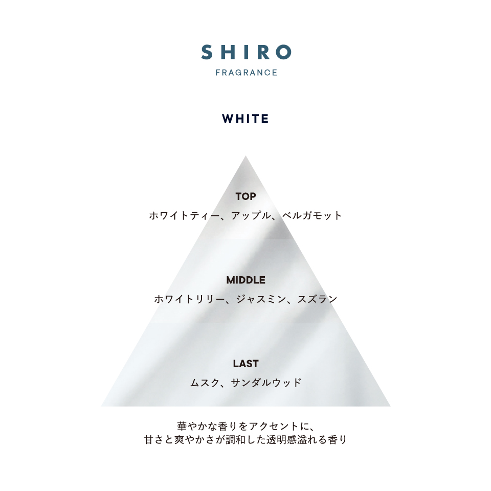 華やかな香りをアクセントに、甘さと爽やかさが調和した透明感あふれる香りのホワイトは、サボンやホワイトリリー、ホワイトティー、アールグレイなどのお好きなヘアミストと組み合わせてお使いいただくのもおすすめです。