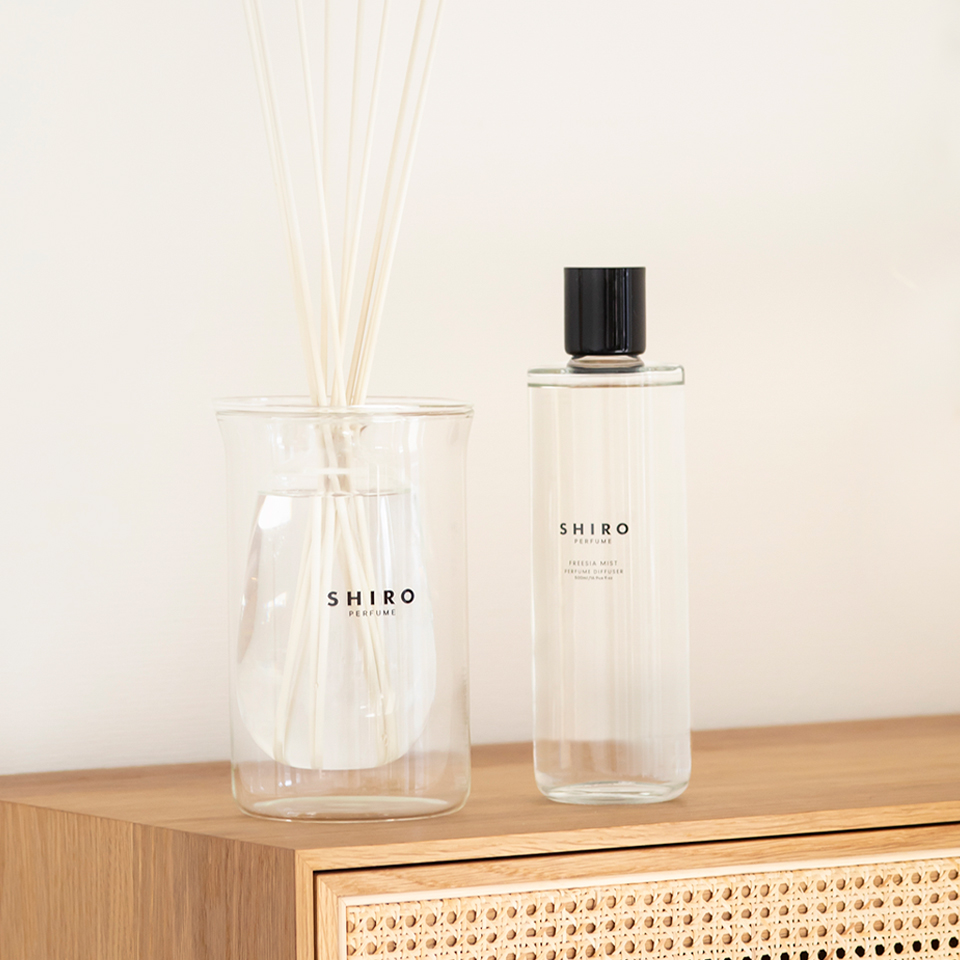 お部屋の雰囲気を彩る パフュームディフューザーキット リビングやベッドルームなど、空間に香りを広げ、お部屋の雰囲気を彩る「パフュームディフューザー」の詰め替え用リキッドとスティック(10本)、グラスベースが一緒になった、空間をSHIRO PERFUMEの贅沢な香りで満たす特別なキット。香りはお好みに合わせて、7種類(FREESIA MIST、JOY WITH YOU、SUNNY MORNING、INTRODUCTION、SPICE OF LIFE、SMOKED LEATHER、MARVELLOUS STAR)からお選びいただけます。香りの背景にあるストーリーに思いを馳せながら、ワンランク上のリラックスタイムをお過ごしください。 <キット内容> ・パフュームディフューザー リキッド ・パフュームディフューザー スティック(10本) ・パフュームディフューザー グラスベース 『パフュームディフューザー リキッド』 ガラス製の容器を採用したパフュームディフューザーの詰め替え用リキッド。 豊かな香りを空間に広げ、感性を刺激しながら、くつろぎの時間を演出します。 1本で約5か月間、香りをお楽しみいただけます。 『パフュームディフューザー スティック(10本)』 エシカルな視点から廃プラスチック素材を使用した専用スティック。フレグランスディフューザースティックに比べ、約2倍の46cmの長さで、より広い空間の隅々まで香りを広げます。本数を増減することで、香りの強さを調整いただけます。 『パフュームディフューザー グラスベース』 どの香りも共通で、繰り返しご使用いただける耐熱ガラス製のパフュームディフューザーの専用容器。「一滴の雫」からインスピレーションを得て、丸みを帯びた内側の容器と、ブランドロゴをあしらった外側の容器が二重構造になったデザインを採用。リキッドを入れる内側の容器が空気の壁に守られるため、室温の変化に左右されにくく、フレッシュな香りを長くお楽しみいただけます。 POINT ・内側と外側の容器を別々に取り外して、お好みで使い分けることも可能です。 ・ディフューザーリキッドを注いで香りを楽しむ他、フラワーベースやバルブベース、ワインクーラーなど、それぞれの生活に合わせた用途でもお使いいただけます。