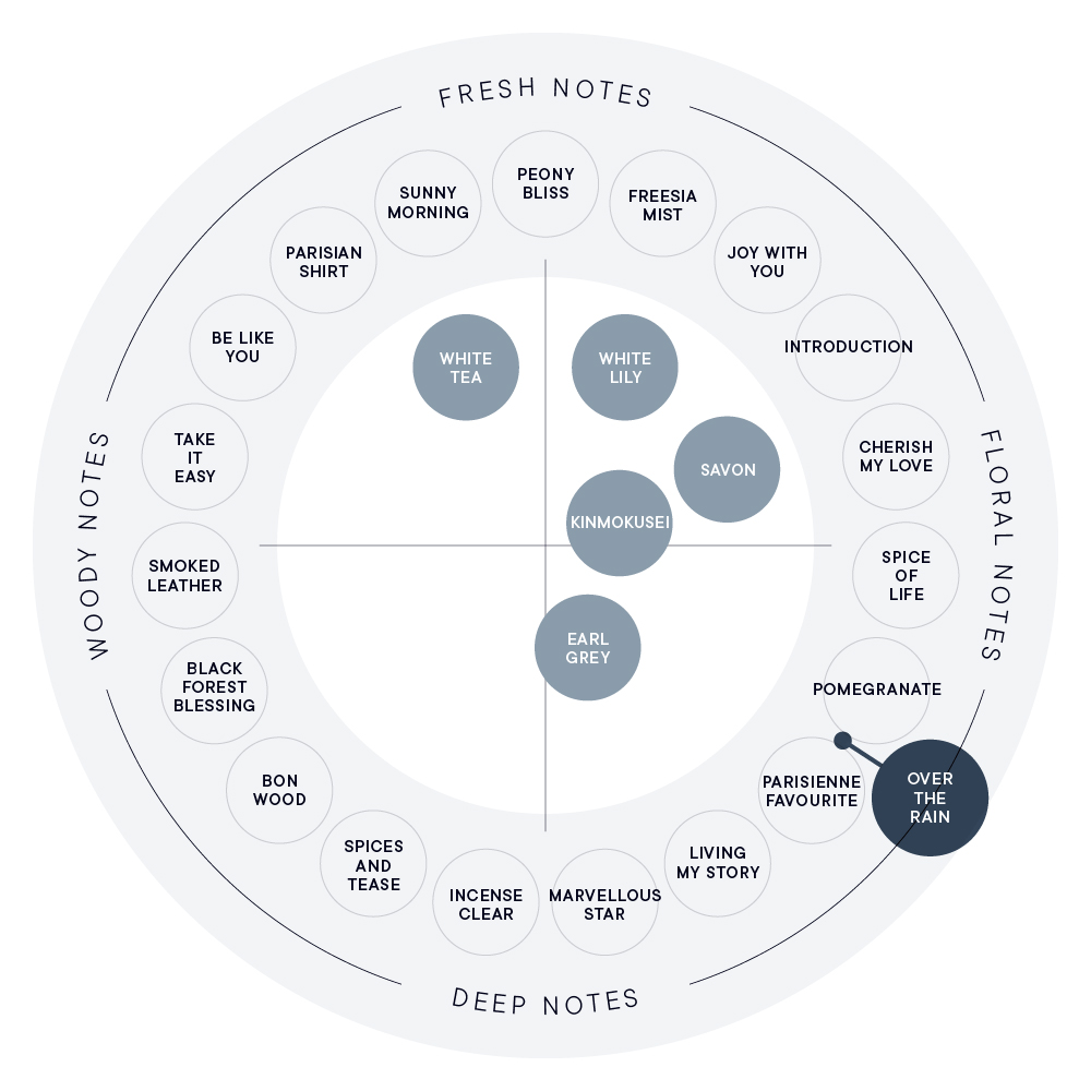 雨がしとしと降る日も、「OVER THE RAIN」の香りに包まれれば、お出かけするのが楽しみになるはず。お好みの箇所に吹きかけて、気分をリフレッシュしながら、これからの季節を清々しくお過ごしください。