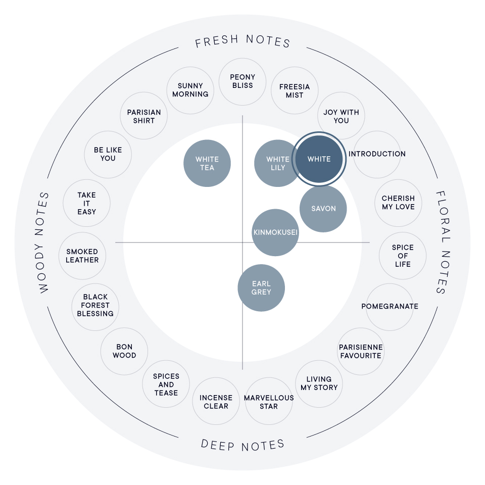 「ホワイト」は、ホワイトリリーやジャスミン、スズランなどの白い花々がやわらかに重なり合う、甘さと爽やかさが調和した、透明感あふれる香りです。