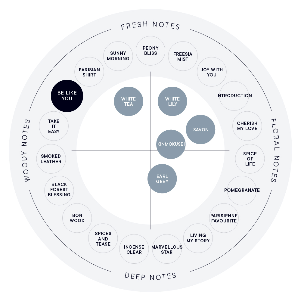 BE LIKE YOUは、軽やかにまとうことのできるウッディアンバーの香り。