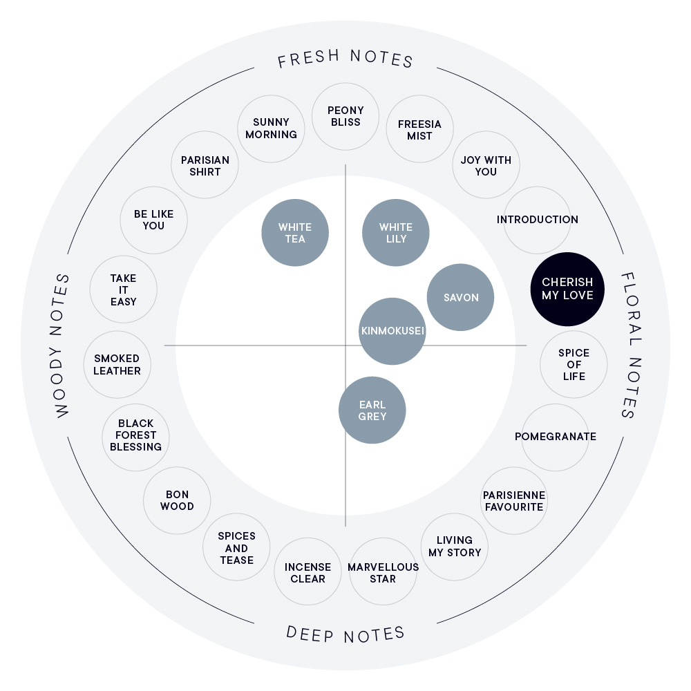 香りの特長 CHERISH MY LOVEは、思わず心ときめくような明るいフルーティーフローラルの香り。 フレッシュさあふれる果実のトップノートにはじまり、スパイスをまとったローズがフローラルに色を添えるミドルノート。そしてムスクやスウィートの甘さと、シダーウッドやアンバーが、ラストノートの優雅なコントラストを生み出します。