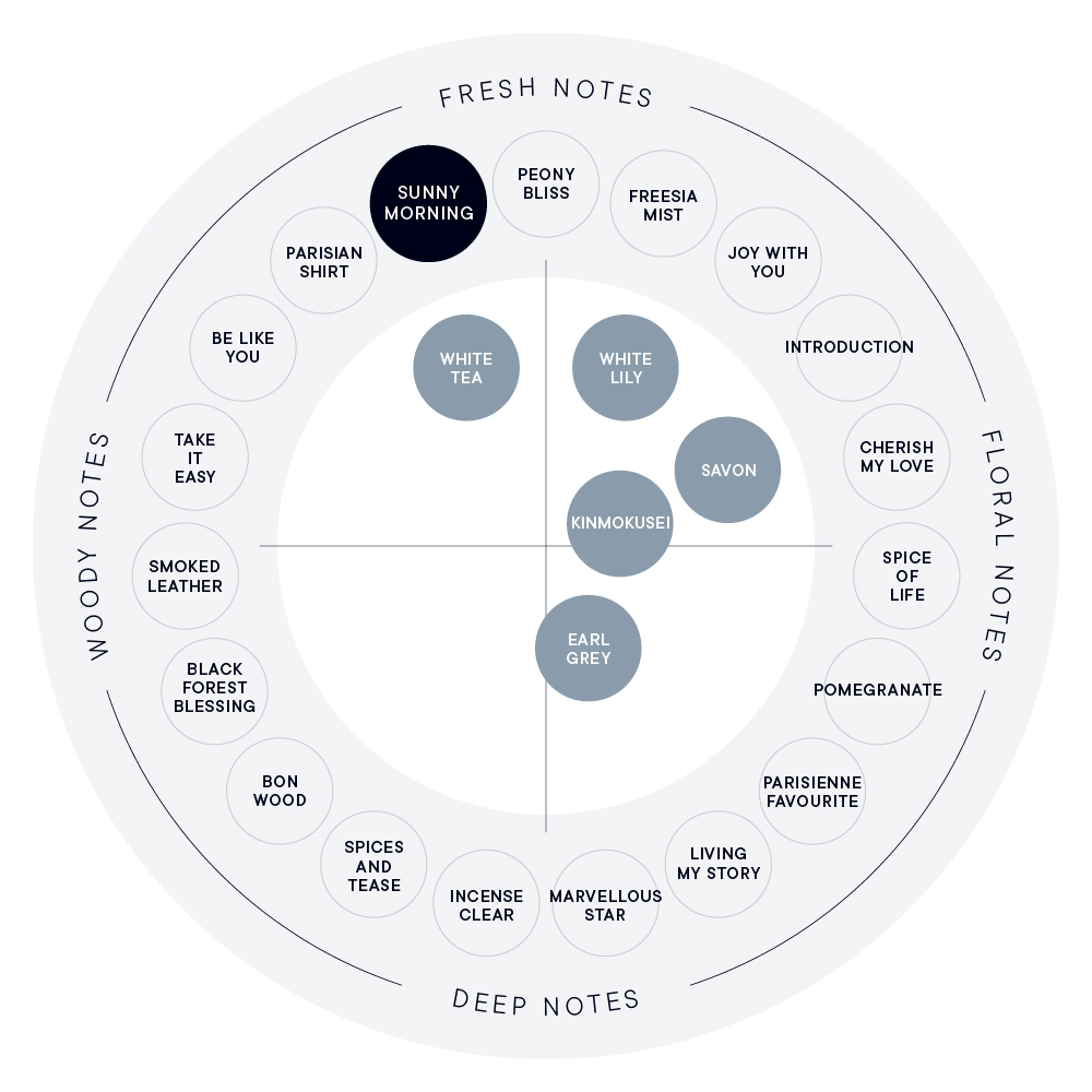 香りの特長 SUNNY MORNINGは、爽やかな朝の目覚めをイメージしたフレッシュフローラルの香り。 イランイランやチュベローズなどの濃厚なリッチフローラルを包み込むのは、軽やかな果実たち。明るくフレッシュなグレープフルーツやブラックカラントに、落ち着きのある甘さが特長のサンダルウッドやムスク、アンバーが溶け合っていきます。