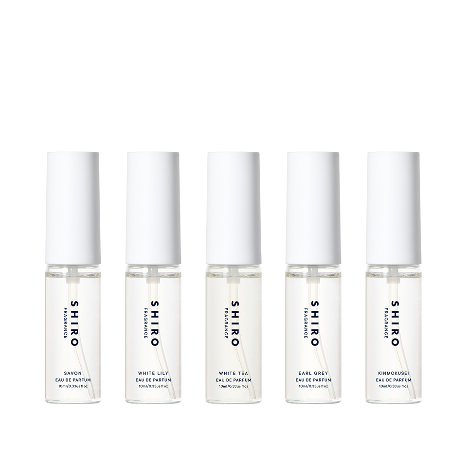人気のオードパルファン、「サボン」「ホワイトリリー」「ホワイトティー」「アールグレイ」「キンモクセイ」5種の香りを楽しむことができるミニセットです。