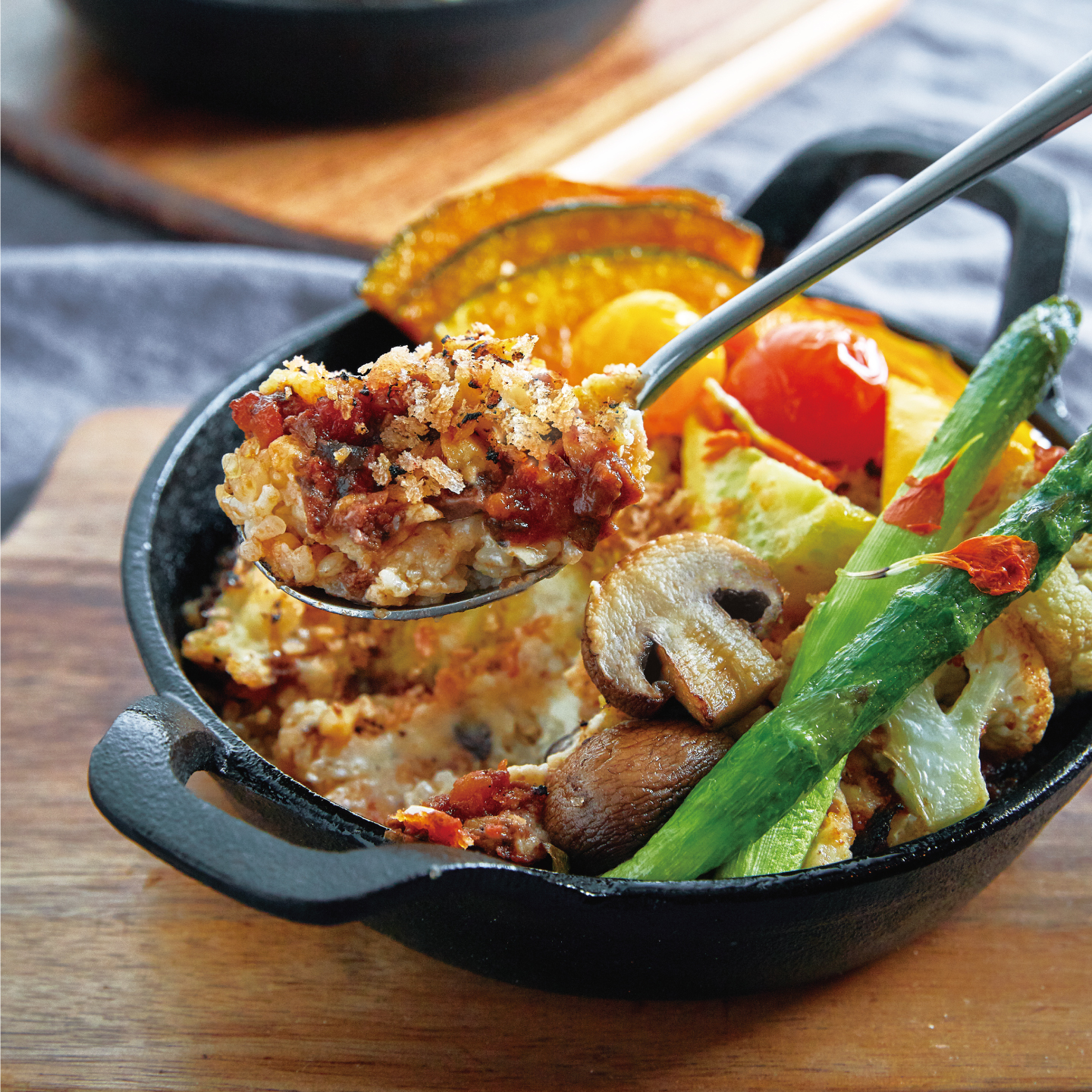 お肉のうまみをとじ込めたミートソースとなめらかな豆乳ホワイトソースのコクが絡み合います。