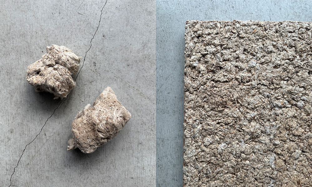 普段は目にすることのない、お店づくりの一部の工程にご参加いただき、SHIROの製品が並ぶディスプレイ台を一緒につくっていきます。使用するのは、デニムづくりの過程で発生する原綿の残渣(ざんさ)などです。今回のワークショップでは、デニムづくりで綿を使用する際、葉柄や枝の繊維、砂などを取り除く作業があり、その中で不純物を除去しきれず、廃棄するしかない部分の残渣を使います。SHIRO ミナモア広島店ではその部分をいただいて、新しいお店のデザインに活用します。