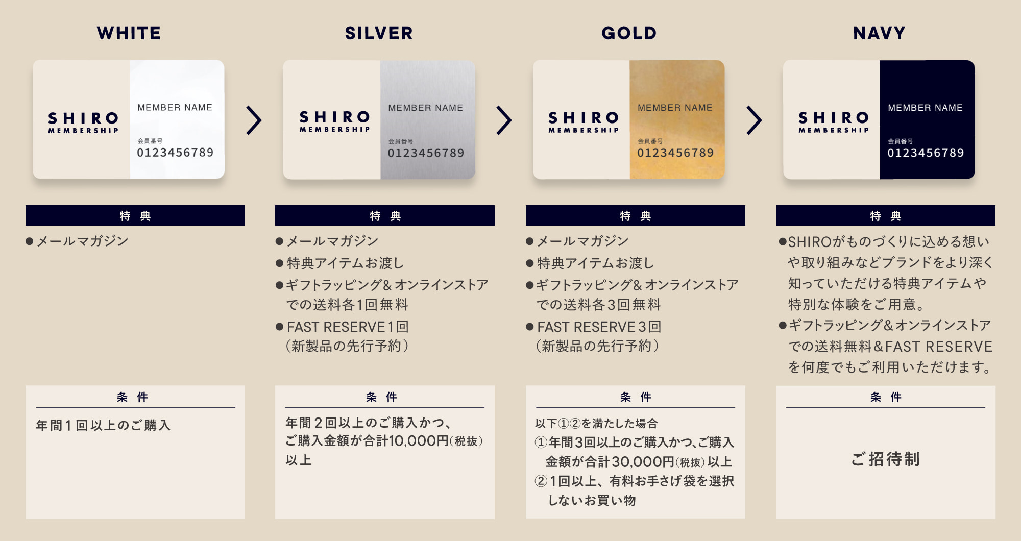 SHIRO 全国直営店舗もしくはオンラインストアでのご購入内容に応じて、会員ステージを付与させていただきます。