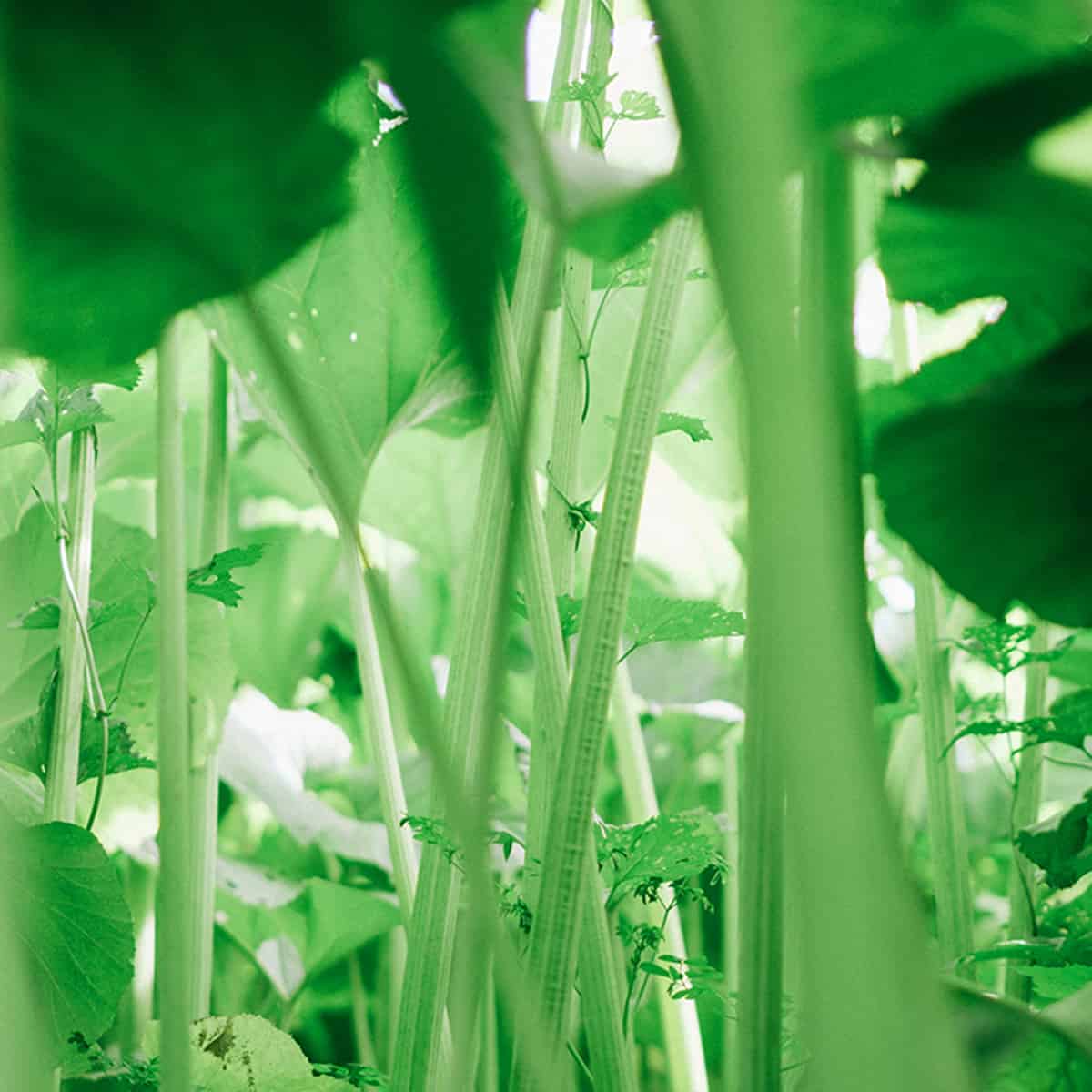 SHIROの前身ブランドであるLAURELの頃から大切にしてきた、“Simply Simple”という考え方。それを象徴する素材のひとつがラワンぶきです。SHIROでは、ラワンぶきの太い茎を切ったときに勢いよく溢れ出るジュース*1を使い、余分なものをできるだけ加えずスキンケアアイテムをつくってきました。まさに、素材そのもののパワーを活かすシンプルなものづくりです。