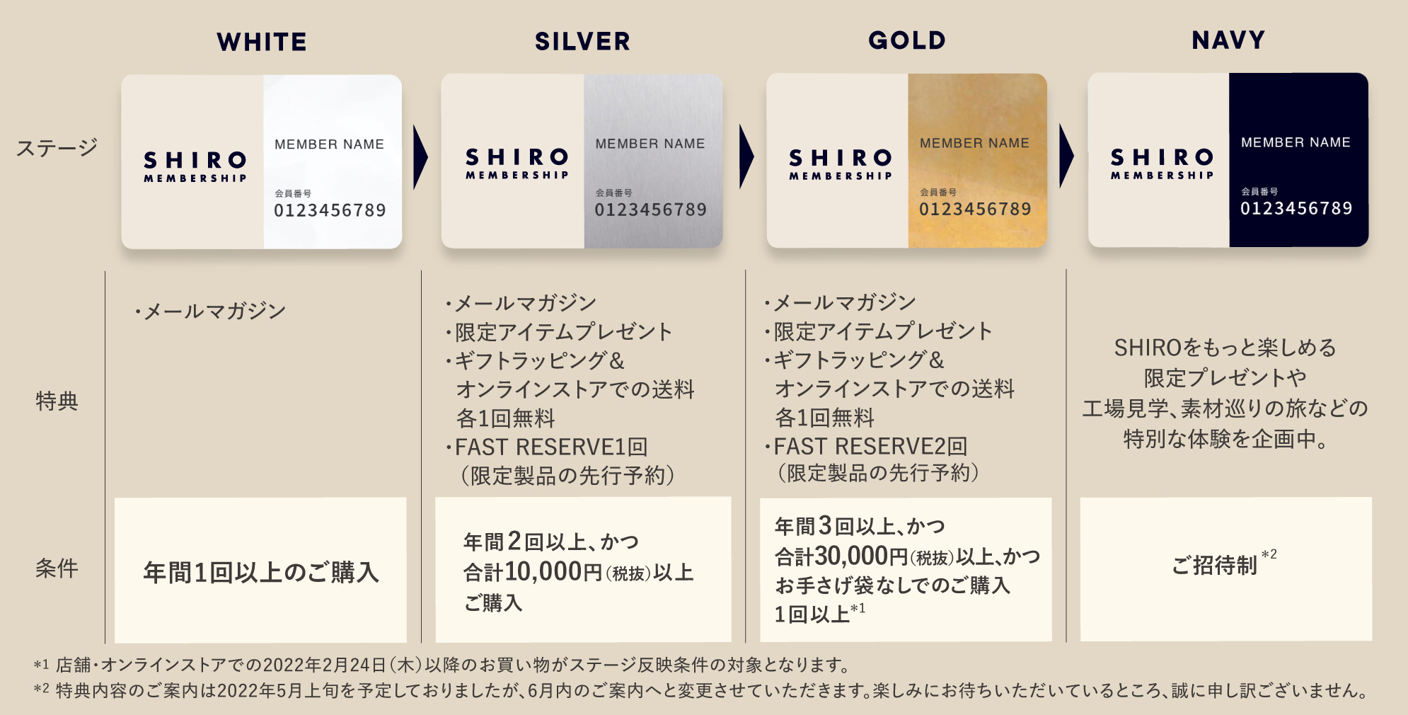 ご購入内容に応じて4つのステージ(WHITE、SILVER、GOLD、NAVY)をご用意しております。会員ステージごとに限定の特典をお受け取りいただけます。