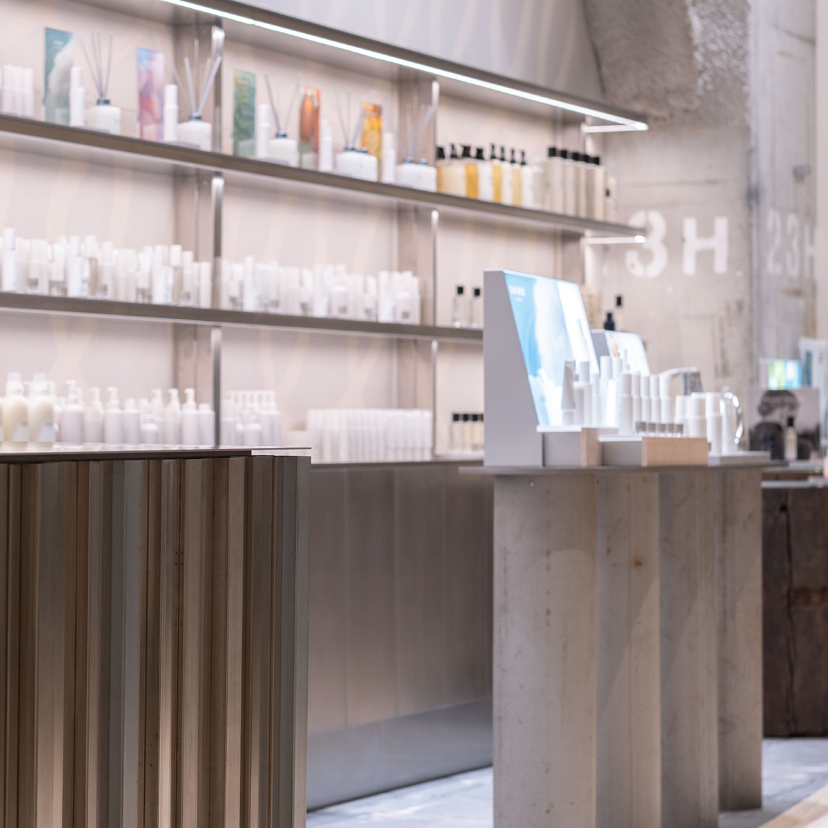 金属の風合いを活かしたミニマルな空間に温もりを添えるのは、ハノクの古材を使用した平台什器です。かつて韓国の伝統家屋に使われていた木材からは、どこか懐かしさが漂い、この土地に暮らす人々の息づかいさえ感じられます。その国の歴史ある産業や文化を尊重しながら、その土地でしかつくることができない個性を表現するのも、SHIROが大切にしていることのひとつ。そのためには、まず私たちがその土地で出会った資材への理解を深めること、さらには、新しい活用方法を提案していくことが重要だと考えています。