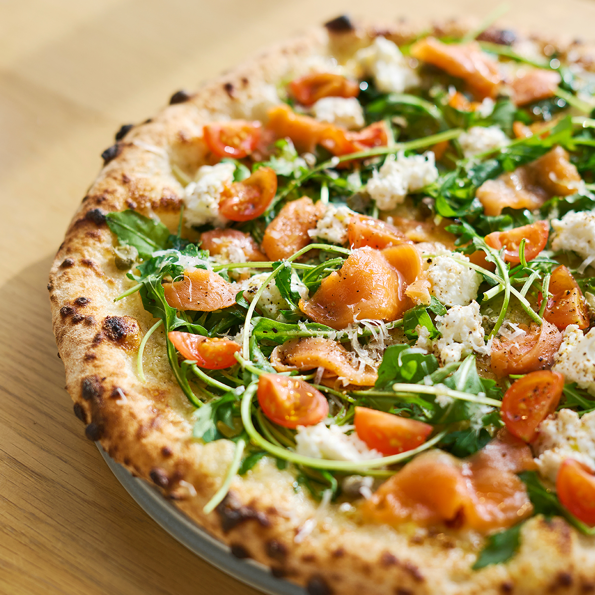 焼きたての生地に、かぐわしいスモークサーモンと白糠町産のリコッタチーズをたっぷりのせたピッツァ。